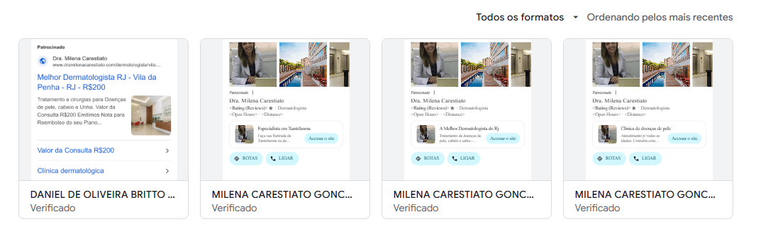 Seus anúncios que estão ativos atualmente no Google. Para melhorar os resultados, deveriam estar com títulos estratégicos que combinem com o que os possíveis pacientes estão pesquisando no momento.
